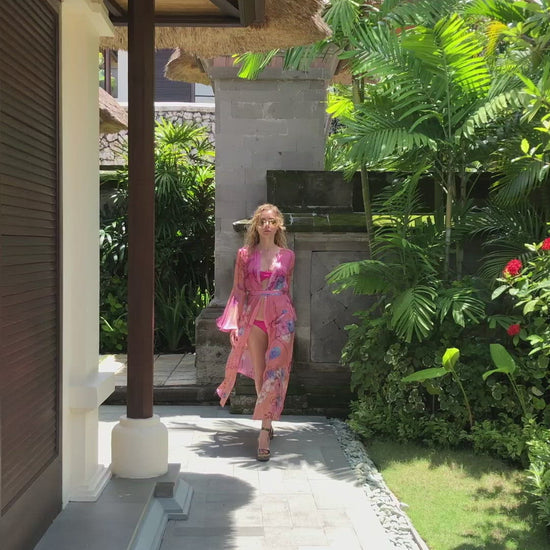 Anya Maj's Lotus Kimono is a definition of a perfect cover-up. Japan-inspired floral print enhances the beauty of this piece. Cut from the finest silk chiffon, an extremely light silk fabric. Use adjustable belt to cinch it at the waist. Print placement varies on each piece.
